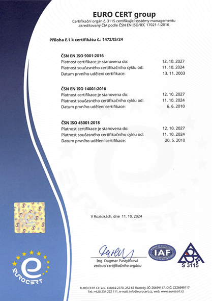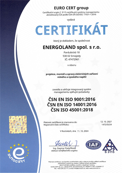 ENERGOLAND, spol. s r. o. je držitelem certifikátu ISO od roku 2000, nyní ČSN EN ISO 9001:2016, ČSN EN ISO 14001:2016 a ISO 45001:2018 s mezinárodní platností. Ověření platnosti certifikátů Politika BOZP, OMS a EMS - ve formátu PDF